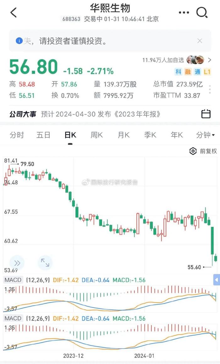 1月30日,就在开盘后不久,“玻尿酸龙头”华熙生物跌惨了,盘中一度下滑逾14%,股价更是跌至55.6元,这一价格创下了公司自2019年11月6日上市以来的历史新低。截至收盘,报58.38元,股价下滑了10.62%,市值281.20亿元,今天上午,股价继续下跌,上午收盘57.53元,打着科创光环上市,玻尿酸龙头如今跌成这样,害死了投资者。