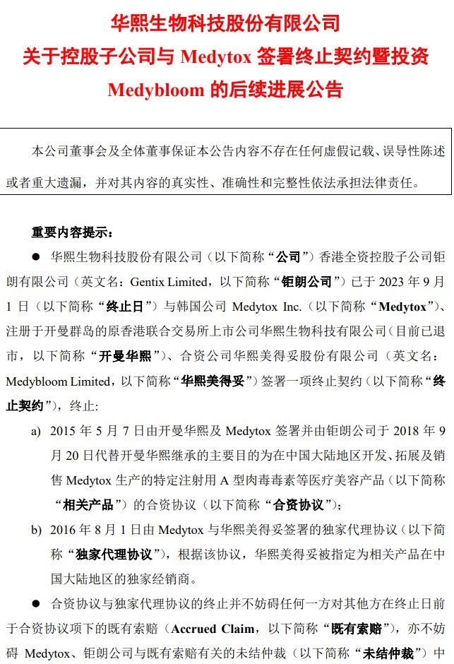 去年9月初,华熙生物曾公告称,全资控股子公司钜朗在9月1日与韩国公司Medytox(美得妥)、开曼华熙、合资公司Medybloom(华熙美得妥)签署终止契约。