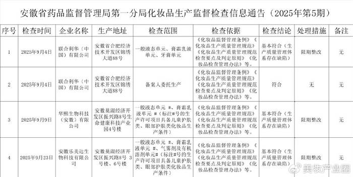 近日,安徽省药品监督管理局第一分局发布了化妆品生产监督检查信息通告(2025年第5期)(以下简称“通告”)。