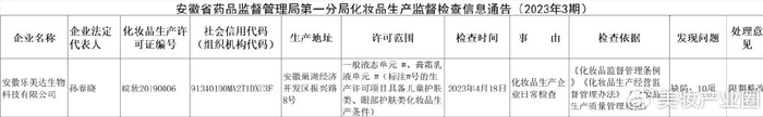 2023年4月,安徽省药品监督管理局第一分局发布的化妆品生产监督检查信息通告(2023年第3期)显示,乐美达在日常检查中被发现存在10项缺陷,同样被责令限期整改。