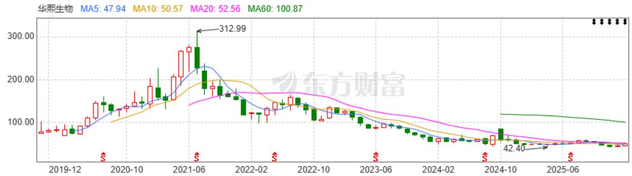二级市场上,华熙生物在风光时市值曾经高达千亿元,但截至2月6日收盘,公司股价报50.20元/股,总市值241.8亿元。