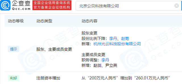 企查查APP显示,近日,北京公贝科技有限公司发生工商变更,新增股东光云科技(688365),持股23.08%。企查查信息显示,该公司成立于2021年1月,法定代表人为李丹,注册资本260.01万元人民币,经营范围包含:销售计算机、软件及辅助设备、电子产品、通讯设备;计算机系统服务;基础软件服务;应用软件服务等。