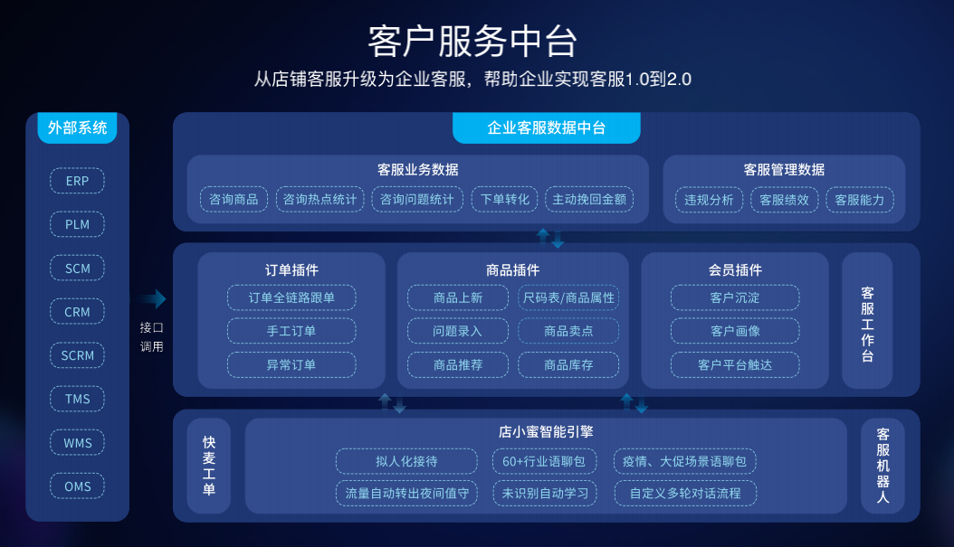 客户服务中台是快麦小智针对规模上亿且有多平台全渠道服务需求的电商企业定制的智能客服解决方案。该方案以阿里店小蜜的智能引擎为底座,通过千牛智能工作台集成多种插件,同时打通ERP、SCM、OMS、WMS等外部系统,实现订单通、商品通、会员通、数据通,帮助客服化繁为简,高效作业。同时,在企业客服数据中台沉淀各类客服业务数据和管理数据,为持续优化企业流程和提升客户满意度提供有力的数据支撑。