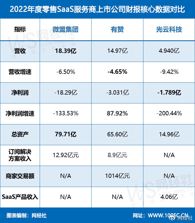 近一个月,三大零售SaaS服务商上市公司接连发布2022年四季报及全年财报,微盟集团(2013.HK)、有赞(08083.HK)和光云科技(688365)这三家企业在营收、净利润方面均有增降,不过在业务结构等方面的表现略有不同。对此,网经社电子商务研究中心进行解读。