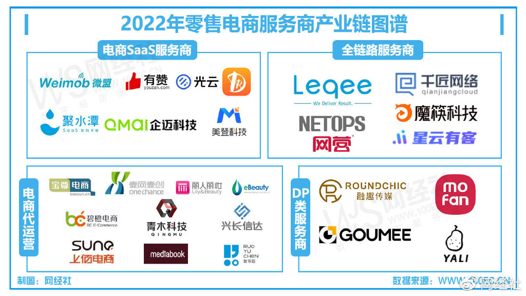 据网经社企业库(COP.100EC.CN)显示,目前电商服务商包括:电商代运营商类:宝尊电商、丽人丽妆、壹网壹创、若羽臣、青木股份、碧橙电商、兴长信达、上佰电商等;电商SaaS服务商类:微盟、有赞、光云科技、聚水潭、企迈科技、美登科技、大人小店;全链路服务商:乐其电商、千匠网络、网营科技、魔筷科技、星云有客等;DP类服务商:融趣传媒、魔范璐玛、构美、新烛文化、鸭梨互动等。