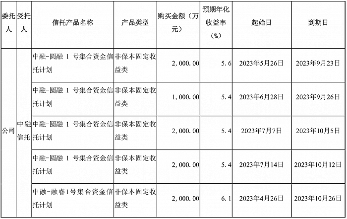 公告显示,光云科技分别于2023年5月26日、2023年6月28日、2023年7月7日、2023年7月14日、2023年4月26日购买了中融信托发行的信托产品圆融1号I 2000万元、圆融1号II 1000万元、圆融1号III 2000万元、圆融1号IV 2000万元、融睿1号2000万元,均为非保本固定收益类产品。