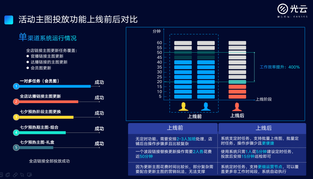 这张图是深绘在主图生成之后,我们在投放端的系统使用前后的对比,工作效率至少提升4倍。举例来说,品牌方跟达播合作,链接更新需要更精准,更高频,比如主播讲解结束后要把链接下掉,以往呢,品牌方需要安排工作人员在屏幕前等待,用了深绘系统之后,我们可以把这种超链接,配置在系统里面进行定时的上下架,可以减少运营人员的工作量。以上提到的所有关于AI+设计的功能,其实都来自深绘商品中台(PIM),商品中台可提供数字化商品生命周期管理的解决方案,包含内容运营、智能设计、数字资产内容管理和任务与协同,这边我们不作详细展开。很荣幸,目前深绘已经赋能了2500多家时尚品牌,希望未来能帮助更多时尚品牌完成数字化升级。