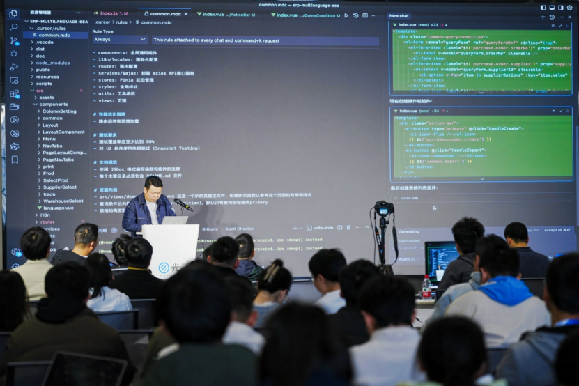 随后,光云科技的工程师们进行了AI技术场景演示,诸多借助AI能力提高开发效率的成果得以共享。他们结合自身工作需求,对集成在AI编程工具中的通用模型进行多轮对话和调教,形成适配特定开发场景的小模型、工作流。