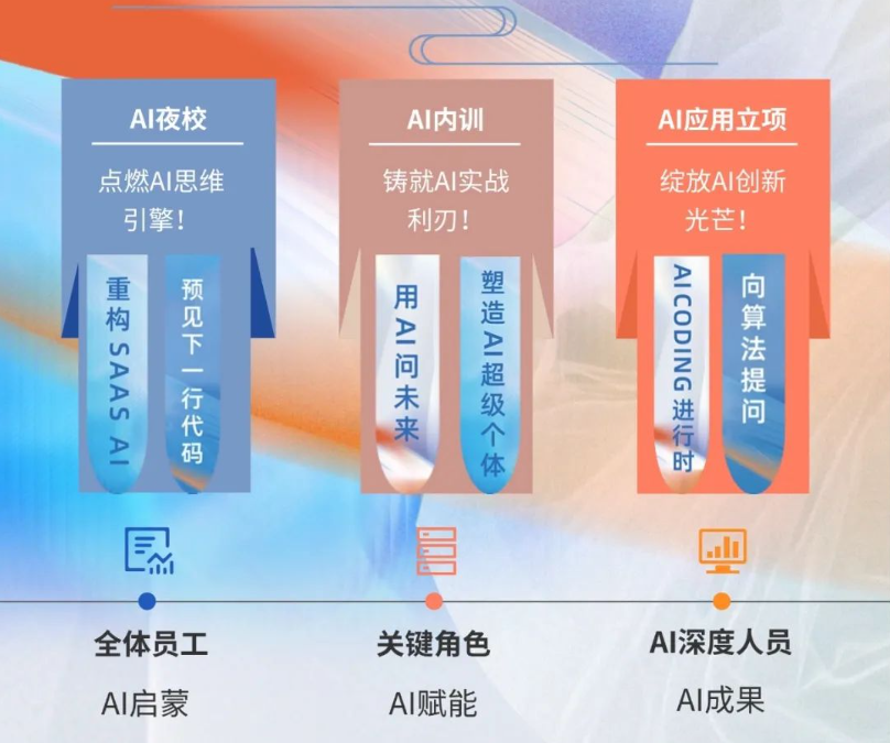 “光云AI夜校”是全员可修的AI启蒙课堂,每周发布精品课程。“光云AI内训”针对关键岗位的赋能特训,助力关键角色成为AI领域先锋。作为核心赛道,“AI应用立项”将评审每个业务线提交的AI应用方案,公司将为优质项目注入AI基金。