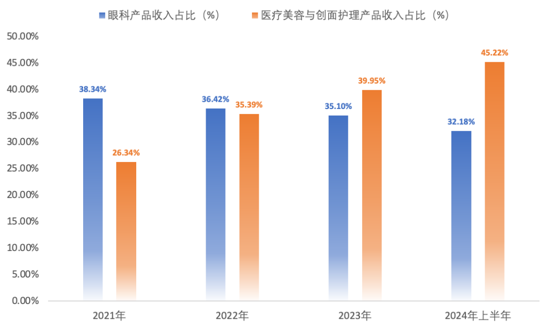 昊海生科的眼科、医疗美容与创面护理产品收入占比情况(%)