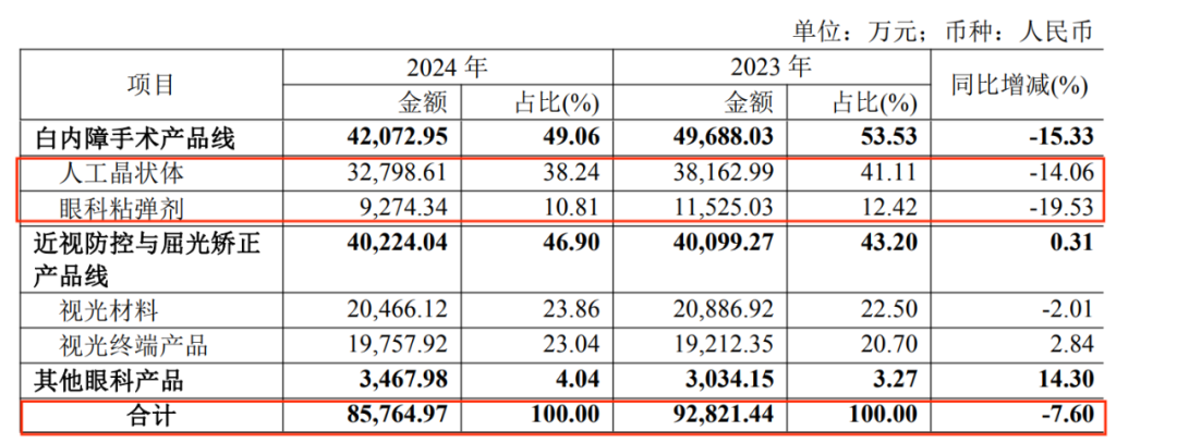对此,昊海生科解释,2023年集团5个品牌的人工晶状体产品及4个品牌的眼科粘弹剂产品全面中选(集采),并于2024年开始逐步实施,中标人工晶状体产品虽在销量方面实现了一定的增长,但由于带量采购中选价格的大幅下降,导致人工晶状体产品于2024的销售收入下降。