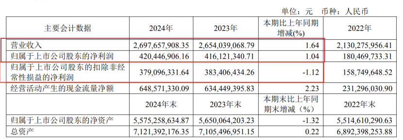 报告期内,公司实现营收26.98亿元,同比增长1.64%;归母净利润4.20亿元,同比增长1.04%。