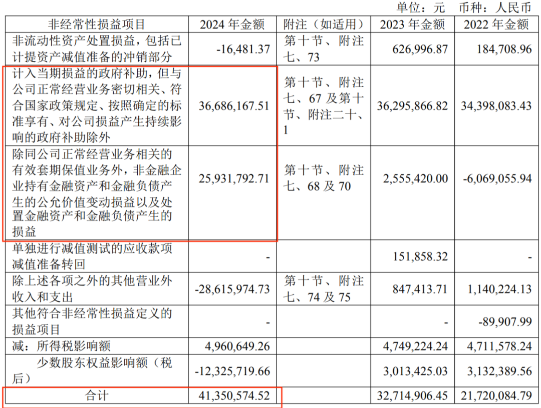 财报显示,2024年,昊海生科计入当期损益的政府补助为3669万元、交易性金融资产公允价值增值2593万元,扣除全部非经常性损益4135万元后,公司的扣非后归母净利润为3.79亿元,同比下滑1.12%。