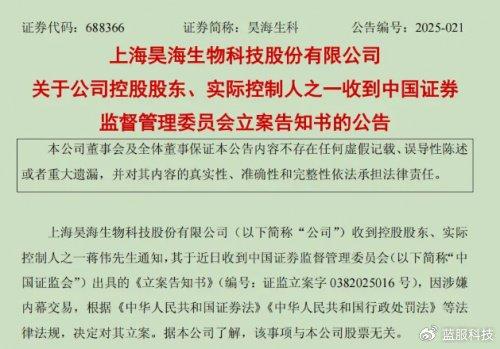 在医美行业蓬勃发展的大背景下,上海昊海生物科技股份有限公司作为行业龙头,一直备受市场关注。然而,2024 年 5 月 7 日晚间的一则公告,却如同一颗重磅炸弹,在资本市场激起千层浪。昊海生科公告称,公司控股股东、实际控制人之一蒋伟因涉嫌内幕交易被证监会立案调查,这一消息瞬间让市场为之震动。