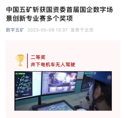 近日,国务院国资委公布了首届国企数字场景创新专业赛获奖名单,中国五矿报送的数字场景应用案例位列其中,工大高科提供的“井下电机车无人驾驶系统”助力中国五矿集团斩获生产运营类二等奖。