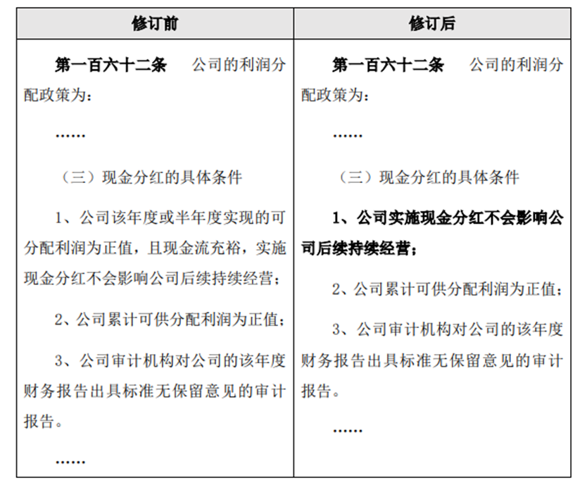 将现金分红的具体条件的第一点从“公司该年度或半年度实现的可分配利润为正值,且现金流充裕,实施现金分红不会影响公司后续持续经营”改成了“公司实施现金分红不会影响公司后续持续经营”。