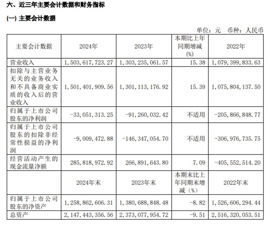 根据2024年度报告,在这一年里,公司实现了15.0亿元的营业收入,与上一年相比,呈现出15.4%的增长态势;不过,净利润方面仍处于亏损状态,亏损额为3305万元。