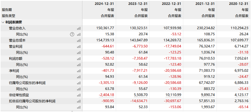 净利润方面同样波动剧烈,2020年净利润为6886.33万元,2021年净利润飙升至67742.07万元,但自2022年开始转盈为亏,当年净利润亏损20586.68万元,2023年亏损9126万元,2024年亏损额达到3305.13万元。