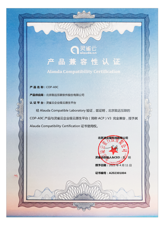 近日,经Alauda Compatible Laboratory验证,致远互联新一代云原生协同运营平台COP-A9C产品与灵雀云企业级云原生平台(简称ACP)V3完全兼容。依托灵雀云的云原生IaaS基础设施建设和运营服务能力,致远互联将更好地赋能大型、集团型组织数字化转型,打造面向未来的数智运营新基座。