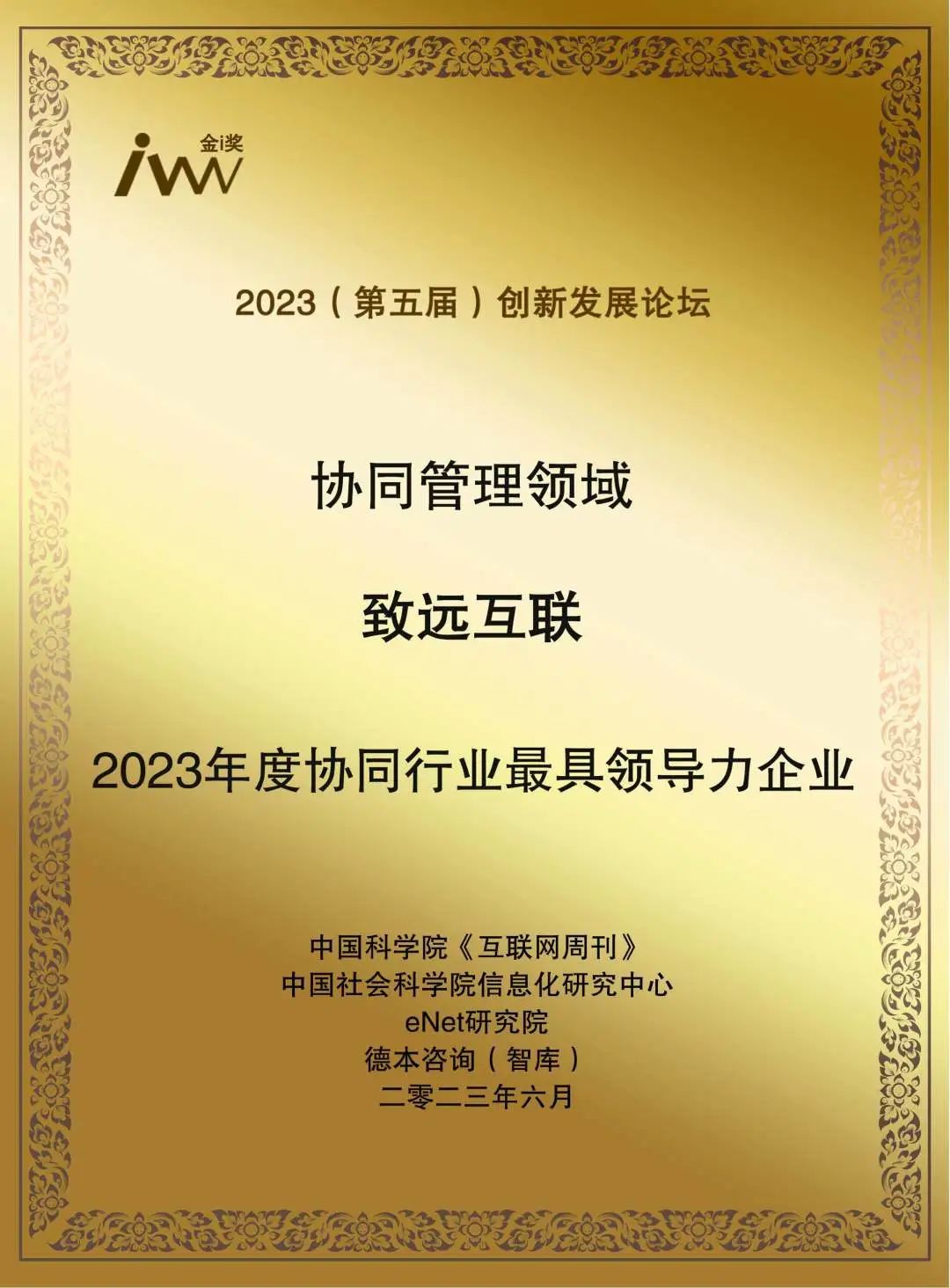 6月26日,由中科院《互联网周刊》、中国社会科学院信息化研究中心、eNet研究院、德本咨询联合主办的“2023(第五届)创新发展论坛”成功举办。本届论坛的重磅奖项—2023创新型金i奖也同时揭晓。致远互联凭借在协同管理领域的专注深耕和持续引领,荣获“2023年度协同行业最具领导力企业”。