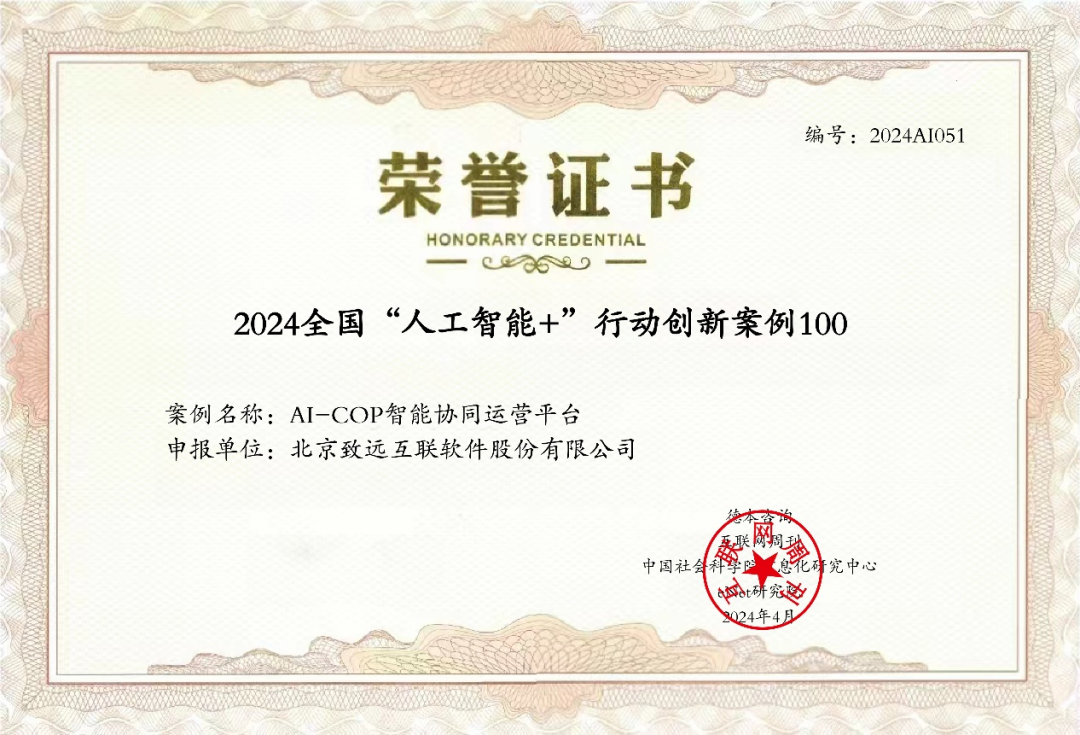 近日,由《互联网周刊》、中国社会科学院信息化研究中心、eNet研究院、德本咨询联合征集的“人工智能+”行动创新案例100榜单正式发布,致远互联AI-COP智能协同运营平台,凭借其卓越的智能化协同运营能力、创新的AI技术应用,以及为企业带来的运营效率提升,荣获“2024全国‘人工智能+’行动创新案例”奖。