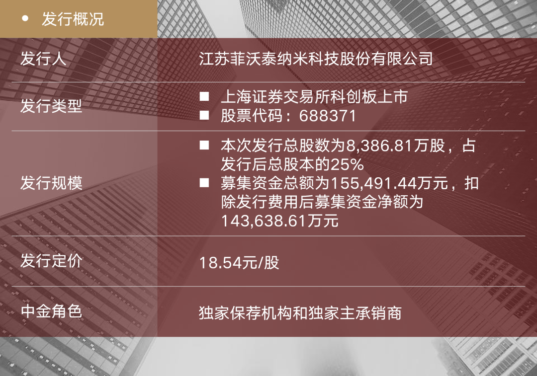 本次发行是A股首家以PECVD技术制备纳米薄膜产品为主营业务的IPO项目。中金公司作为本项目的独家保荐机构和独家主承销商,全面牵头项目整体工作,设计多项解决方案,助力项目顺利完成。在发行阶段,中金公司凭借对纳米薄膜综合防护行业的深度理解,协助菲沃泰挖掘投资亮点,以过硬的执行能力和优质的投行服务获得了客户的高度认可。未来,中金公司将继续全力协助纳米薄膜综合防护行业企业对接资本市场,为纳米薄膜综合防护领域的发展贡献自身力量。