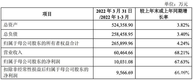 2022年第一季度,国博电子的营业收入为6.05亿元,同比增长68.21%;归属于母公司股东的净利润为1.00亿元,同比增长67.63%;扣除非经常性损益后归属于母公司股东的净利润为9566.69万元,同比增长66.46%。