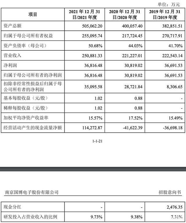 财务方面,国博电子2019年、2020年和2021年的营收分别为22.25亿元、22.12亿元和25.09亿元;净利润分别为3.70亿元、3.08亿元和3.68亿元,扣非后净利润分别为8306.65万元、2.87亿元和3.51亿元。