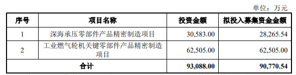 本次发行可转换公司债券的募集资金总额不超过人民币90,770.54万元(含本数),扣除发行费用后,拟用于深海承压零部件产品精密制造项目、工业燃气轮机关键零部件产品精密制造项目。
