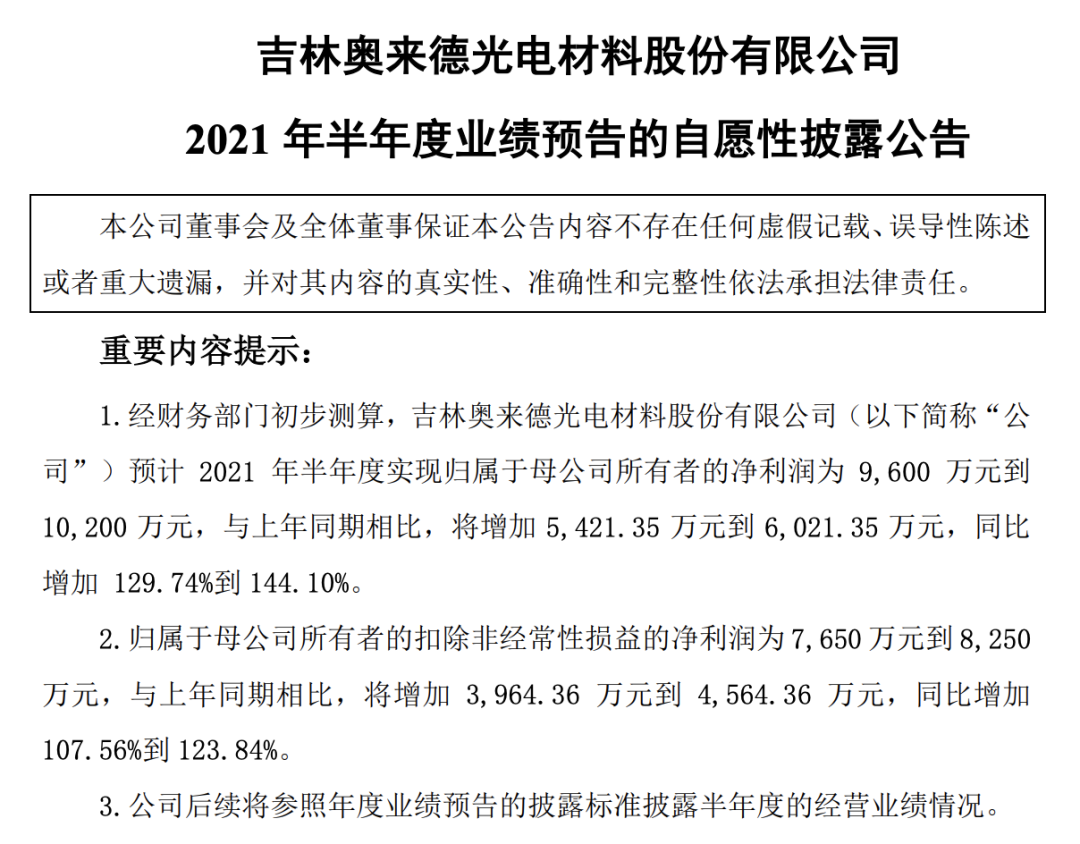 奥来德公告,预计上半年实现净利润9600万元-1.02亿元,同比增加129.74%-144.1%,本期有机发光材料和蒸发源设备销售额较上年同期均有较大幅度增长。
