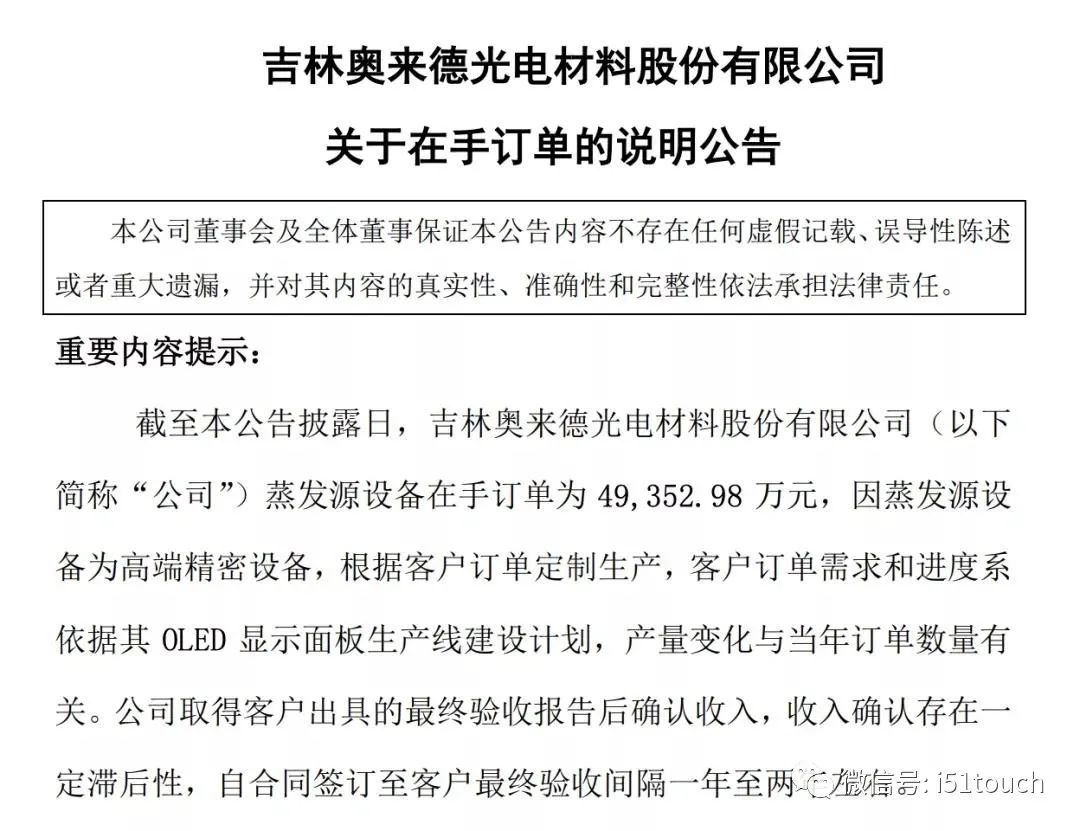 公告还显示,奥莱德于近日在上证E互动平台回复投资者咨询时称,“目前公司蒸发源在手订单总金额约为5亿元”,为便于广大投资者了解详细情况,现作说明如下: