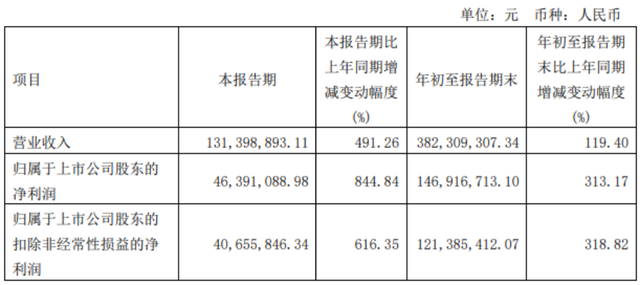 集微网消息 10月26日,奥来德发布三季报称,2021年7-9月,公司实现营业收入为1.31亿元,同比增长491.26%,归属于上市公司股东的净利润为0.46亿元,同比增长844.84%。