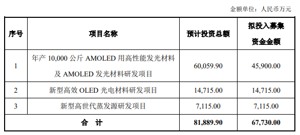 据悉,奥来德募投项目包括“年产10,000公斤AMOLED用高性能发光材料及AMOLED 发光材料研发项目”、“新型高效OLED光电材料研发项目”、“新型高世代蒸发源研发项目”。