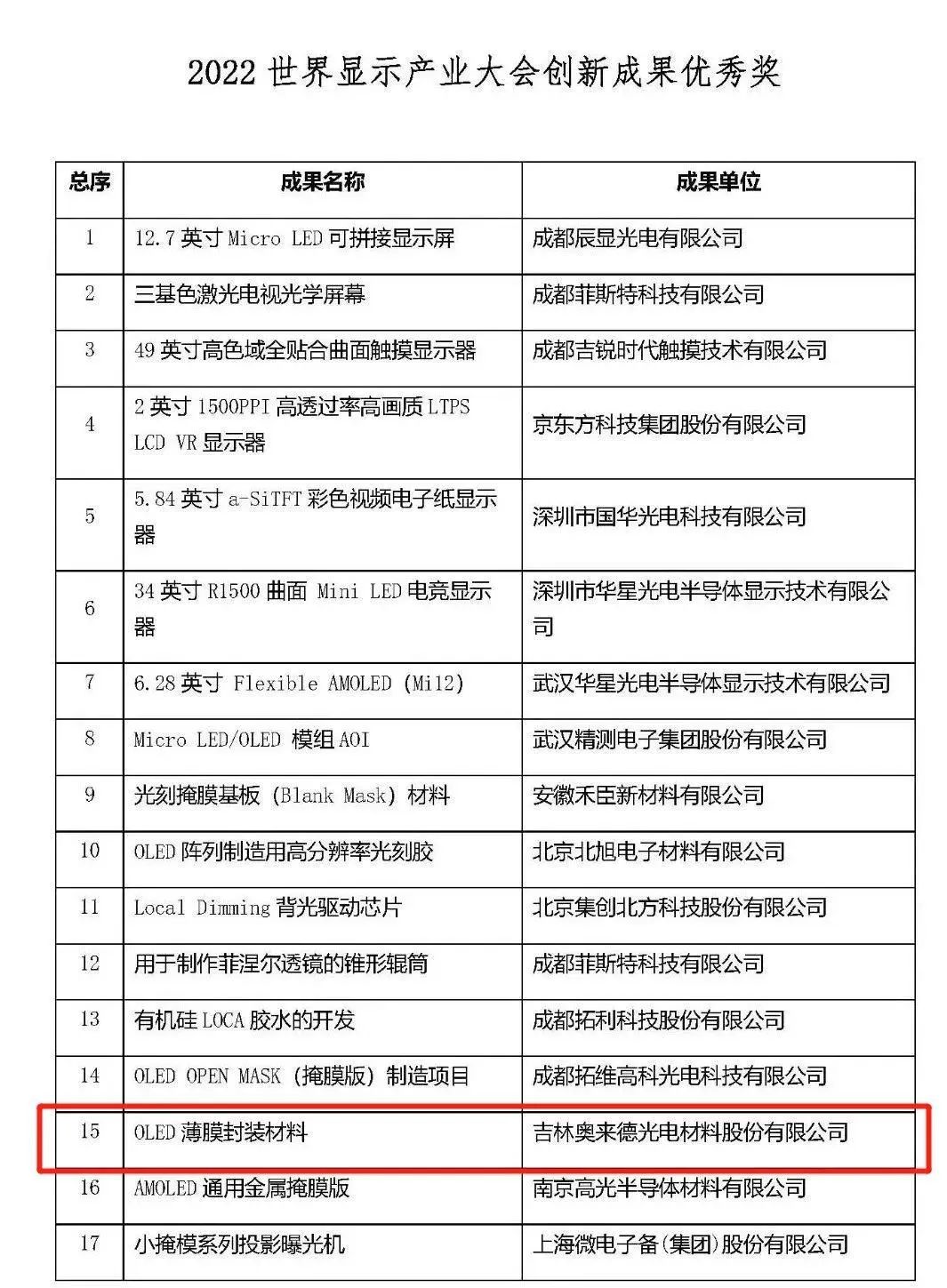 11月30日,由四川省人民政府、工业和信息化部主办的2022世界显示产业大会在四川省成都市开幕。在开幕仪式上,国际信息显示学会中国区总裁、俄罗斯工程院外籍院士严群发布“2022世界显示产业大会创新成果”。吉林奥来德光电材料股份有限公司(以下简称“奥来德”或“公司”)的创新成果“OLED薄膜封装材料”荣获“2022世界显示产业大会创新成果优秀奖”。