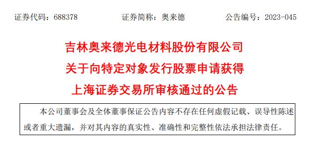 中国经济网北京6月13日讯吉林奥来德光电材料股份有限公司(简称“奥来德”,688378.SH)昨晚发布《关于向特定对象发行股票申请获得上海证券交易所审核通过的公告》。吉林奥来德光电材料股份有限公司于2023年6月12日收到上海证券交易所(以下简称“上交所”)出具的《关于吉林奥来德光电材料股份有限公司向特定对象发行股票审核意见的通知》。通知主要内容如下:“吉林奥来德光电材料股份有限公司向特定对象发行股票申请符合发行条件、上市条件和信息披露要求。本所将在履行相关程序并收到你公司申请文件后提交中国证监会注册。”