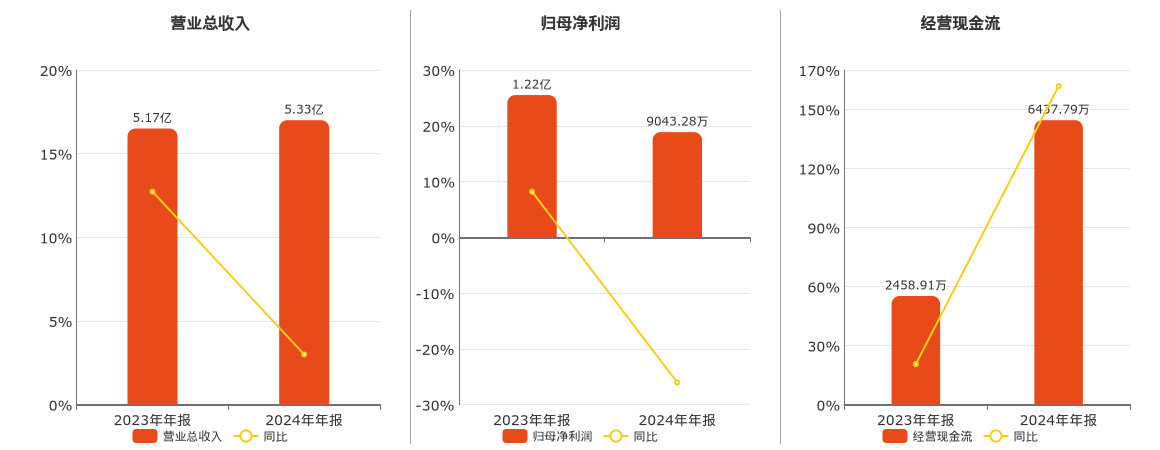 公司营业总收入为5.33亿元。归母净利润为9043.28万元,较去年同报告期归母净利润减少3183.32万元,同比较去年同期下降26.04%。经营活动现金净流入为6437.79万元。