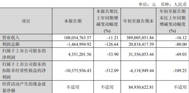 年初至报告期末,公司实现营业收入3.89亿元,同比减少16.12%;归属于上市公司股东的净利润3135.61万元,同比减少69.03%;归属于上市公司股东的扣除非经常性损益的净利润为-611.89万元;经营活动产生的现金流量净额8493.06万元。