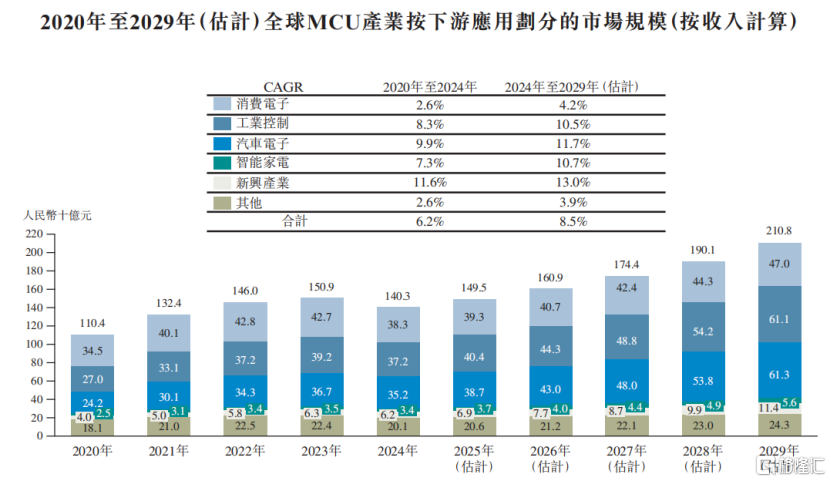 根据弗若斯特沙利文资料,2024年全球MCU市场规模达1403亿元,预计2029年增至2108亿元,CAGR为8.5%。