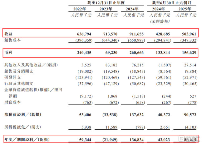 2022年、2023年、2024年和2025年1-6月(报告期),公司的收入分别为6.37亿元、7.14亿元、9.12亿元、5.04亿元,净利润分别为5934万元、-2195万元、1.37亿元、8647万元。