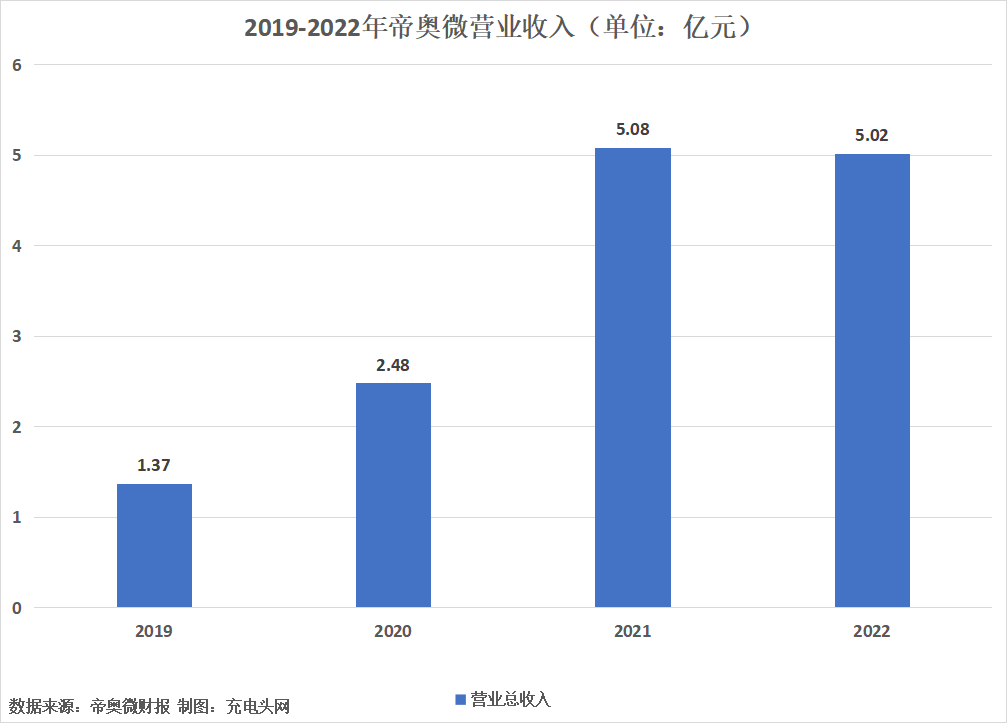根据帝奥微报告数据显示,2019-2022年,帝奥微营业收入分别为1.37亿元、2.48亿元、5.08亿元、5.02亿元,同比增长40.31%、81.15%、105.08%和-1.19%。