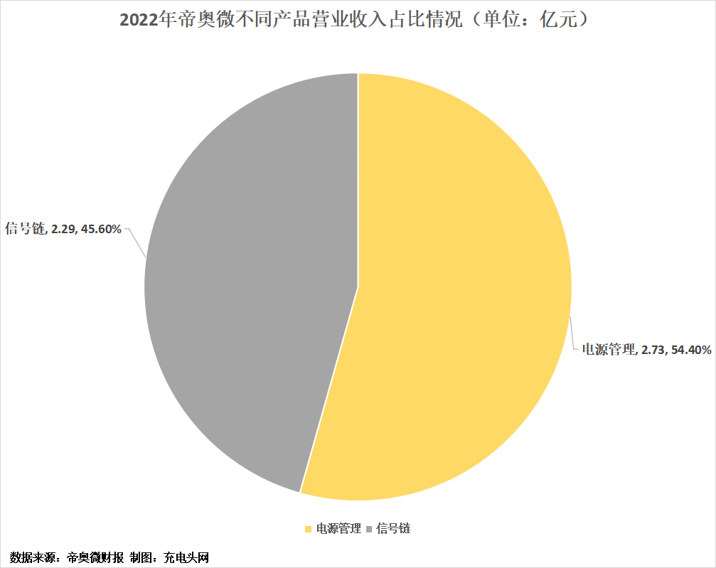 分产品看:2022年,帝奥微电源管理营业收入2.73亿元,营收占比54.40%;信号链营业收入2.29亿元,营收占比45.60%。