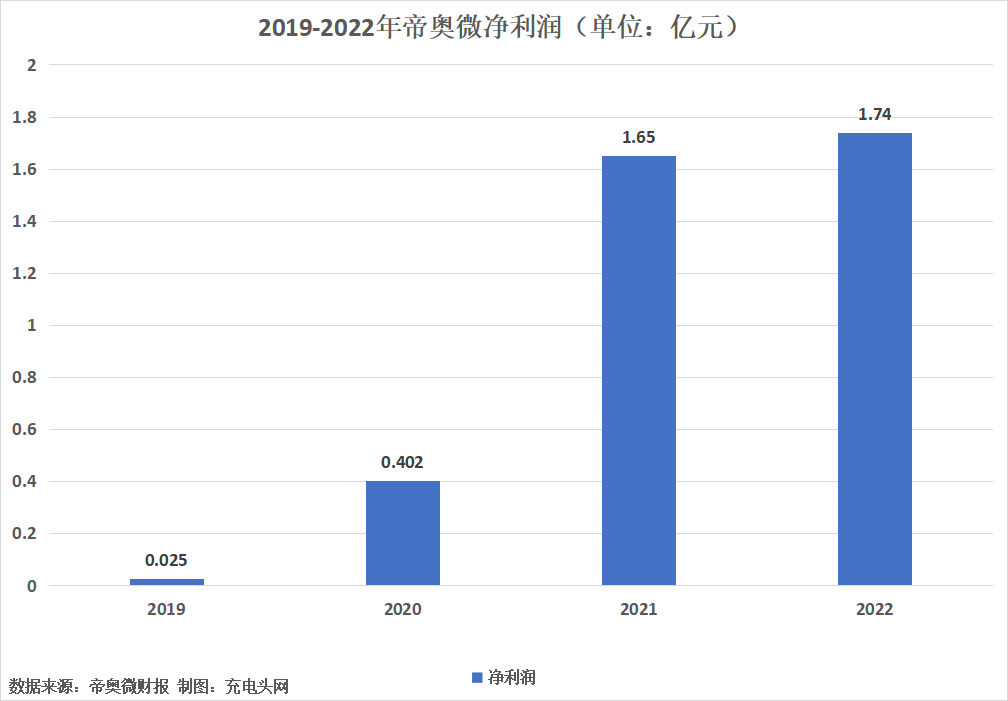 2019—2022年,帝奥微净利润分别为0.025亿元、0.402亿元、1.65亿元、1.74亿元,同比增长131.33%、1482.26%、310.77%和5.23%。