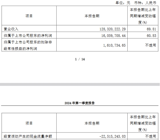 2024年第一季度,公司营业收入1.28亿元,同比增长69.81%;归母净利润1605.97万元,同比增长60.83%;扣非净利润161.07万元;经营活动产生的现金流量净额为-2251.52万元。