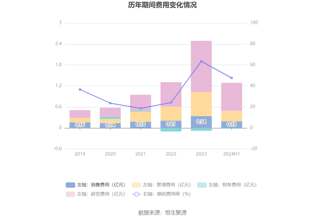 2024年上半年,公司期间费用为1.27亿元,较上年同期增加3106.41万元;但期间费用率为47.63%,较上年同期下降5.31个百分点。其中,销售费用同比增长22.49%,管理费用同比下降8.23%,研发费用同比增长55.41%,财务费用由去年同期的-405.18万元变为-230.71万元。