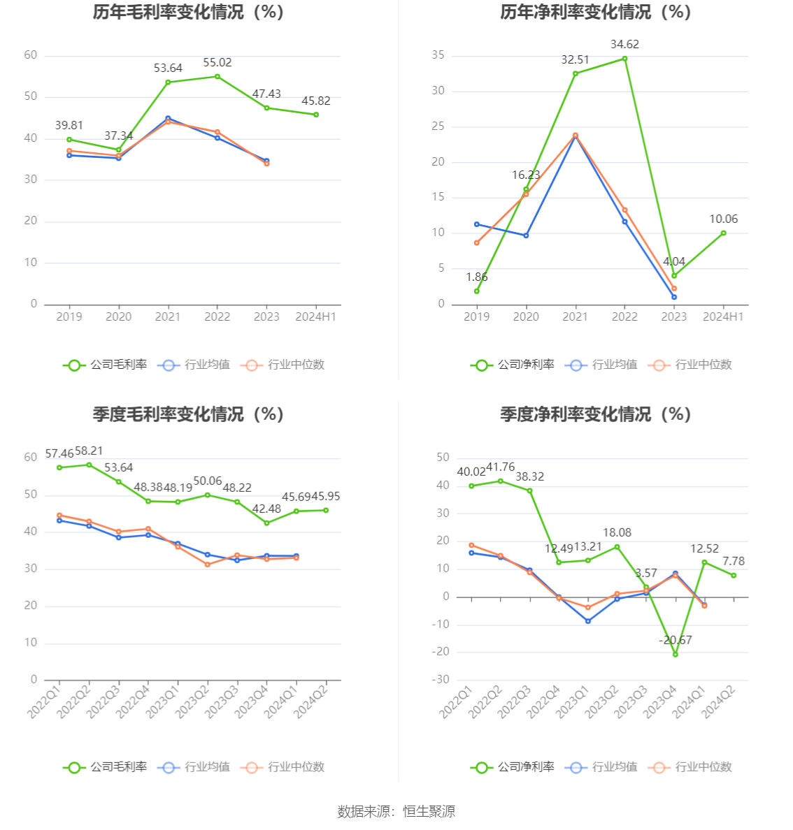2024年上半年,公司毛利率为45.82%,同比下降3.46个百分点;净利率为10.06%,较上年同期下降5.98个百分点。从单季度指标来看,2024年第二季度公司毛利率为45.95%,同比下降4.11个百分点,环比上升0.26个百分点;净利率为7.78%,较上年同期下降10.30个百分点,较上一季度下降4.74个百分点。