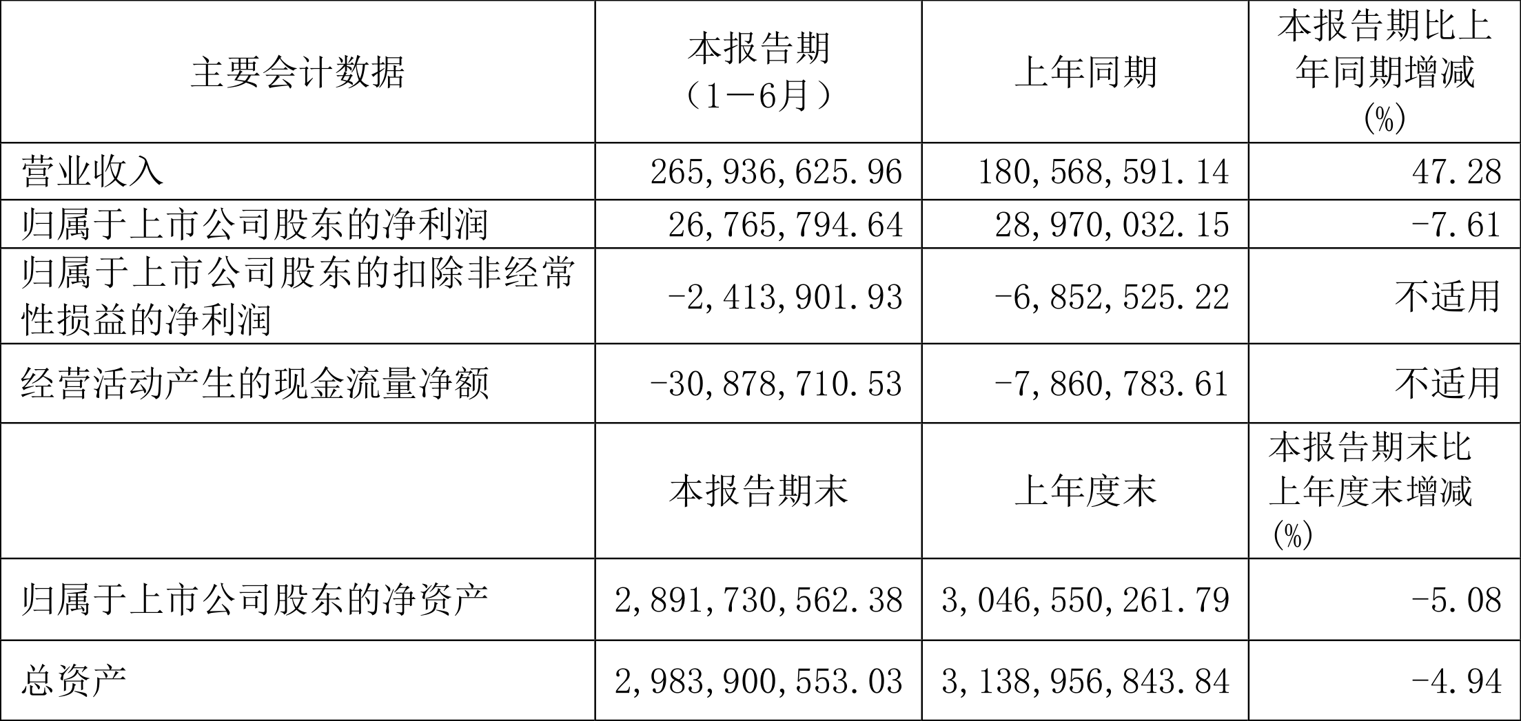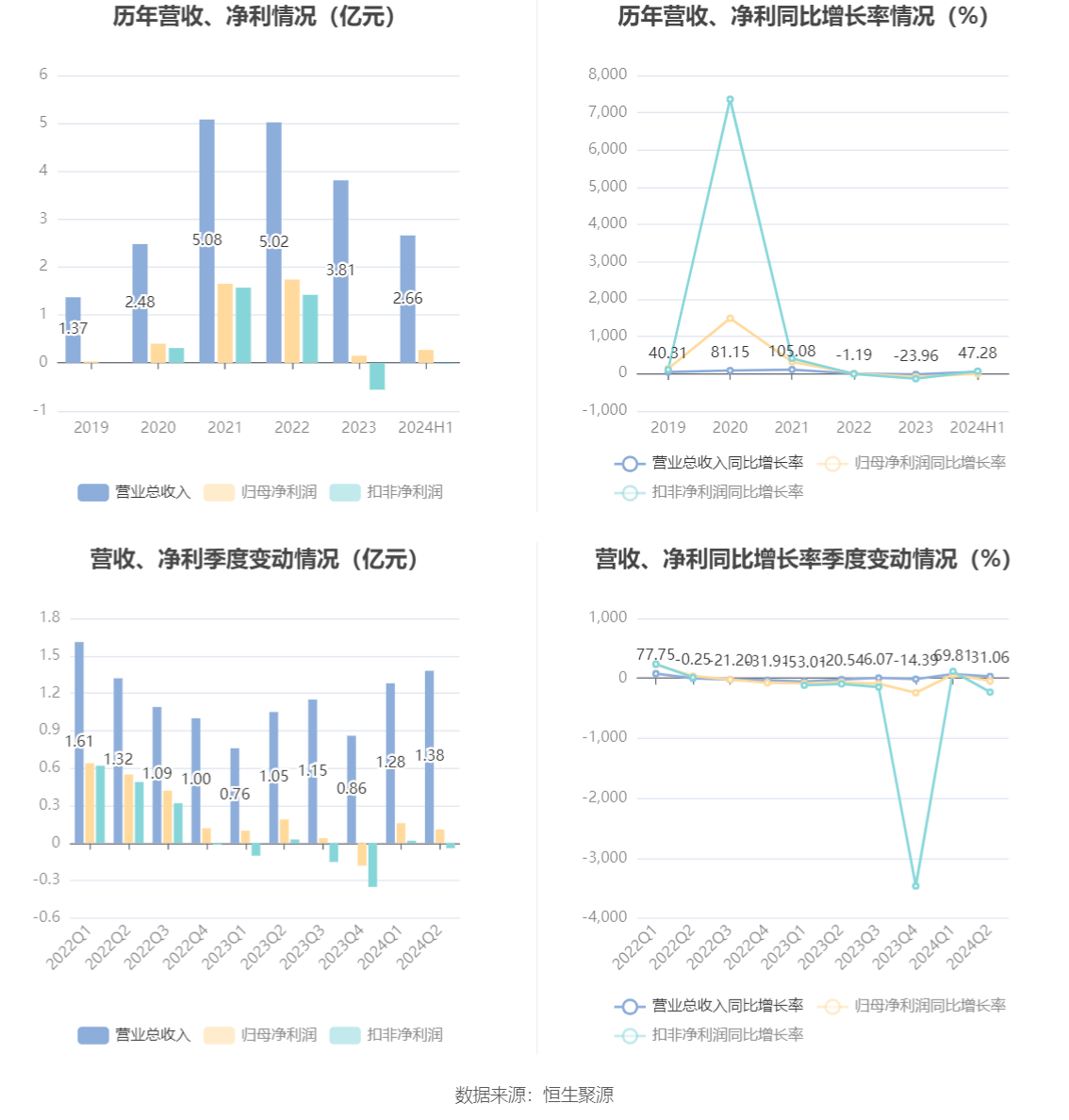 2024年上半年,公司经营活动现金流净额为-3087.87万元,同比减少2301.79万元;筹资活动现金流净额-1.86亿元,同比减少1.21亿元;投资活动现金流净额2.09亿元,上年同期为2.51亿元。