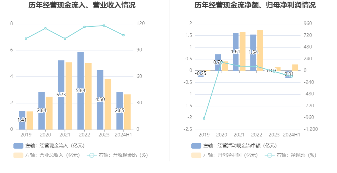 2024年上半年,公司营业收入现金比为107.06%,净现比为-115.37%。
