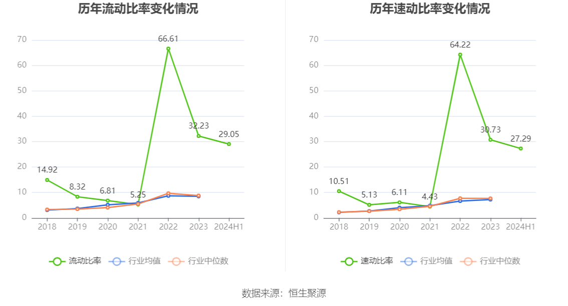 2024年上半年,公司流动比率为29.05,速动比率为27.29。