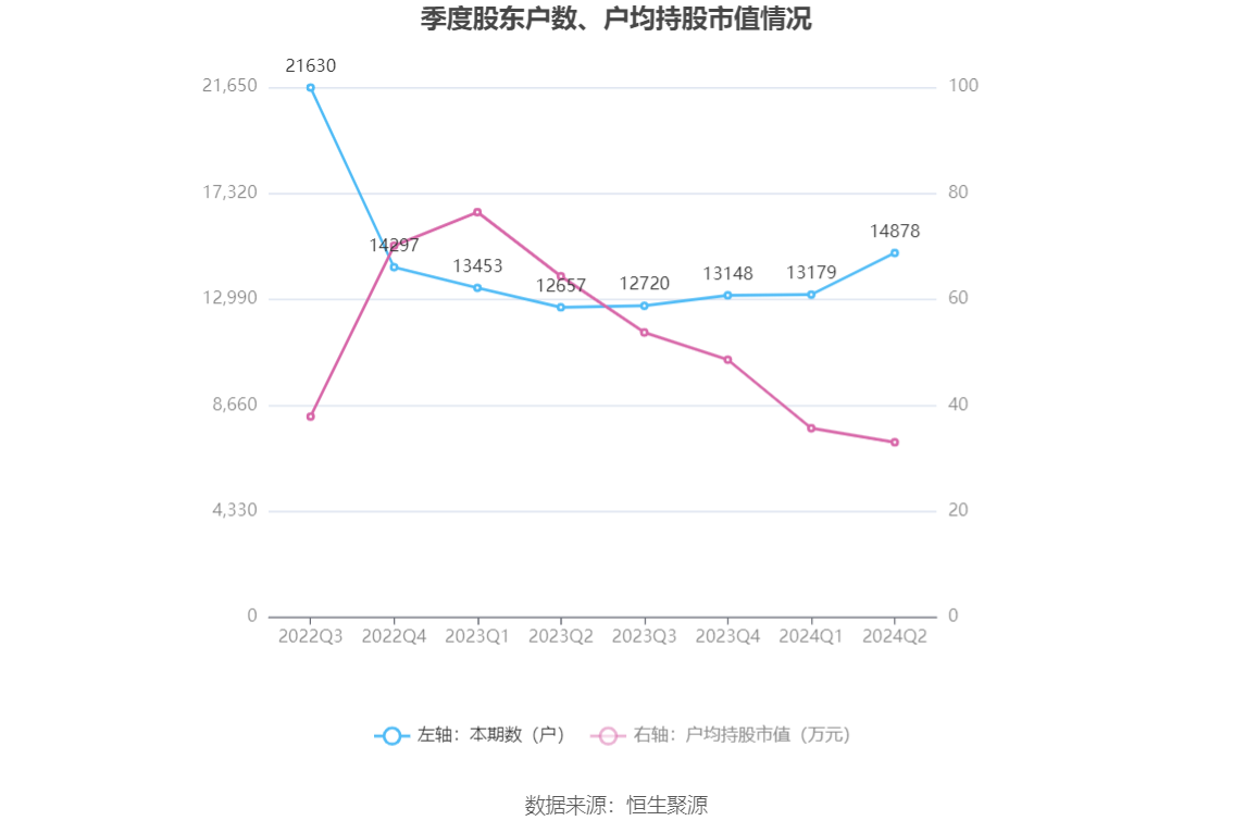 筹码集中度方面,截至2024年上半年末,公司股东总户数为1.49万户,较一季度末增长了1699户,增幅12.89%;户均持股市值由一季度末的35.67万元下降至33.02万元,降幅为7.43%。