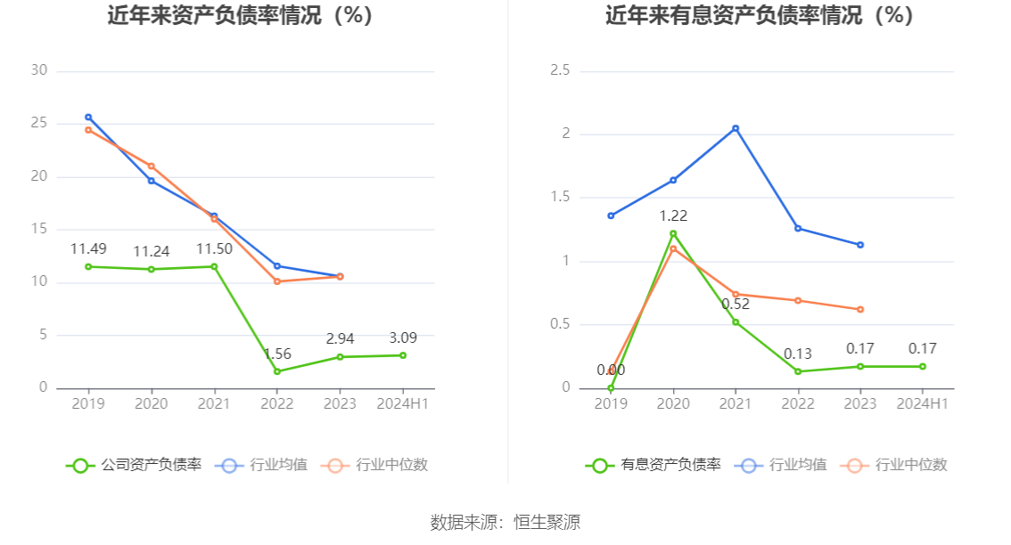 在偿债能力方面,公司2024年上半年末资产负债率为3.09%,相比上年末上升0.15个百分点;有息资产负债率为0.17%,相比上年末基本持平。